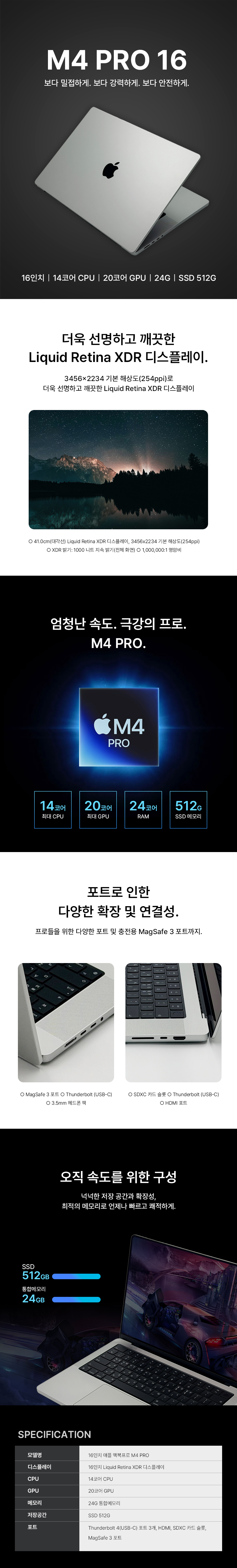 • 16인치 애플 맥북프로 M4PRO/14C/20G/24G/512G 기본형 (24/30/36개월)