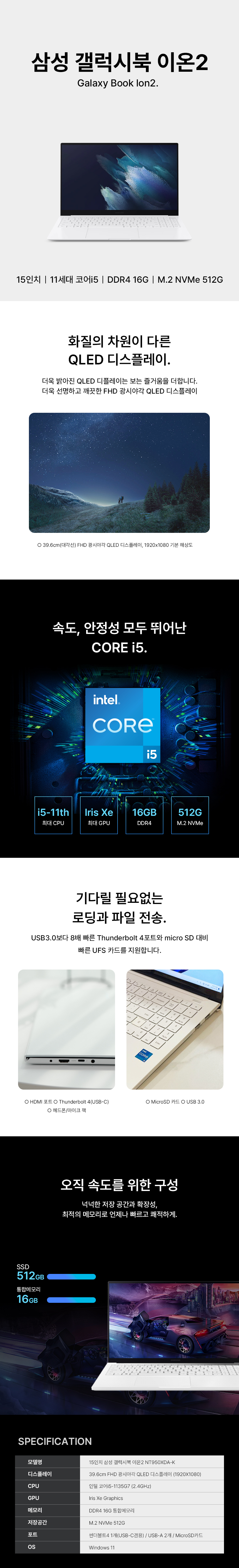• 15인치 삼성 갤럭시북 이온2 NT950XDA-K i5-11TH/16G/512G (12개월)